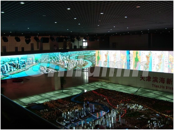 据了解,金融中心一楼大厅内内部结构为一楼、二楼中心部分相通,可以站在二楼俯瞰一楼近300平方米的于家堡金融区整体沙盘模型,而此次LED显示屏的位置则是二楼走廊外四面的墙体,主要用于播放于家堡的历史发展足迹及未来规划的视频,观众在观看于家堡金融区整体沙盘模型的同时,稍微抬头就能观看相关视频,了解到于家堡的过去、现在、未来。