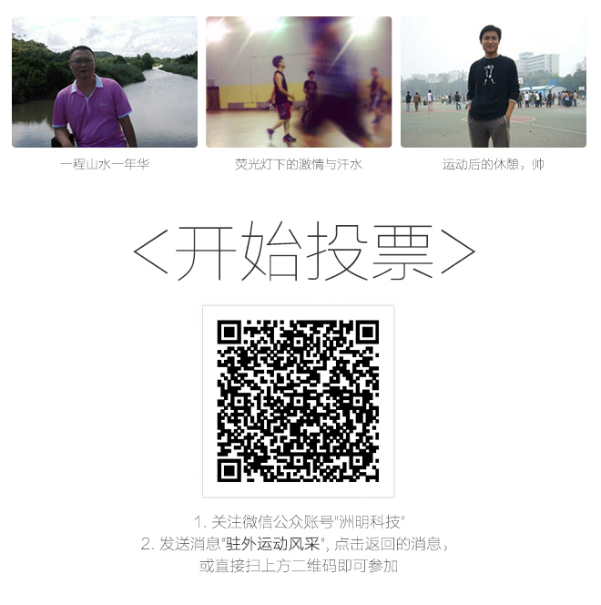活动说明:本次运动风采展示活动将评选出30张最具运动风采的照片,其中个人照20张,集体照10张,照片得分根据网络投票得出,本评选接受公司内部及社会公众网络投票,并且可多投,谁夺冠,你的手指说了算,欣赏最美运动图景,为你心目中最具运动风采的选手投上你珍贵的一票吧! 奖项设置:入选照片奖金设置为:个人运动风采奖150元/张,集体运动风采奖200元/张。 投票方式 (微信投票):1. 关注微信公众账号"来利国际旗舰厅科技"2. 发送消息"驻外运动风采", 点击返回的消息即可参加