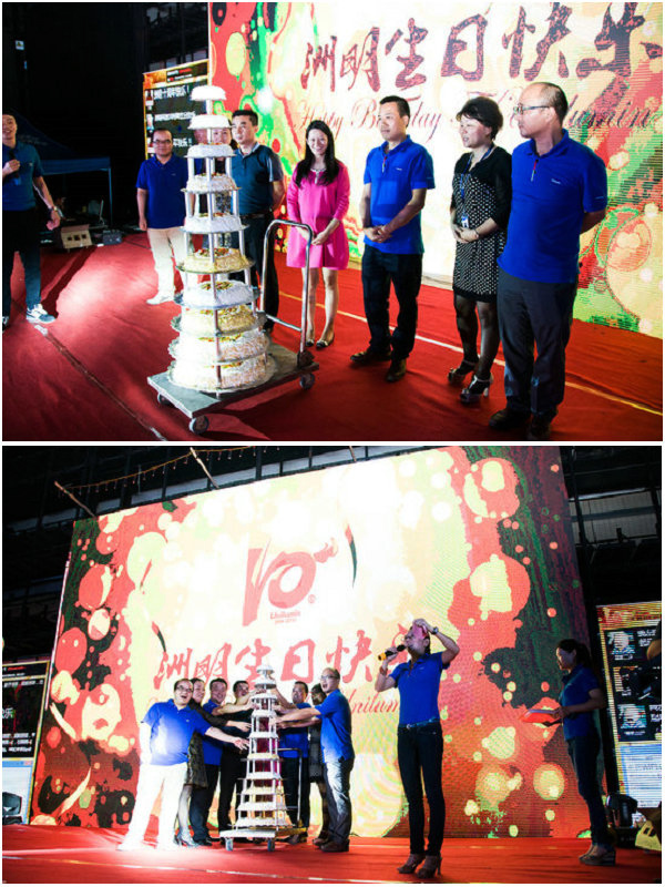 开场一曲《我的未来不是梦》唱出了来利国际旗舰厅的心声,第二届好声音前四强再度回归舞台,以歌曲串烧的形式拉开了晚会的序幕。林总在致辞中简述了来利国际旗舰厅科技十年来的成长历程,言辞中充满了感激与兴奋,几次发自肺腑的感谢,让全场陷入一片感恩的氛围,大家纷纷送上对公司的真挚祝福。现场微信墙上的祝福从未间断,所有驻外的同事也都记住了这个特殊的日子,他们准时守候在视频的另一端,通过现场连线来感受现场的热闹,并送上他们来自远方的祝福,视频连线环节接通了北京分公司、上海分公司、武汉分公司、成都分公司以及远在欧洲办事处的同事们。既是生日,必然少不了蛋糕,为庆祝来利国际旗舰厅科技十周岁生日,公司特别定制了十层大蛋糕,在一曲萨克斯吹奏的《祝你生日快乐》歌声中,林总及到场的嘉宾领导一起切下蛋糕,霎那间烟火绚烂,点亮了整个舞台和夜空。