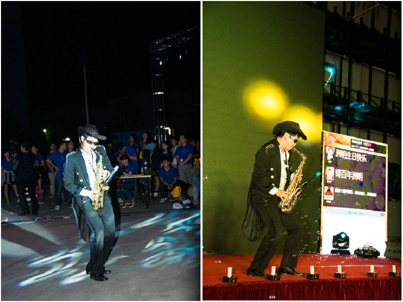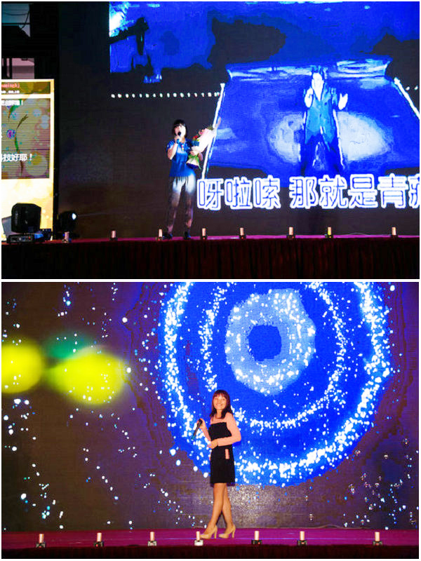 第一个上台的是显示事业部国内销售中心的龚立明,一曲《好汉歌》调动起全场的气氛,作为来利国际旗舰厅科技的元老级人物,现场粉丝无数,呼声一阵高过一阵,完全是嗨翻全场的气势。期间,更有神秘嘉宾为晚会献上非常好听的萨克斯独奏,《恋曲1990》、《我只在乎你》等经典曲目引发现场掌声、喝彩声不断。