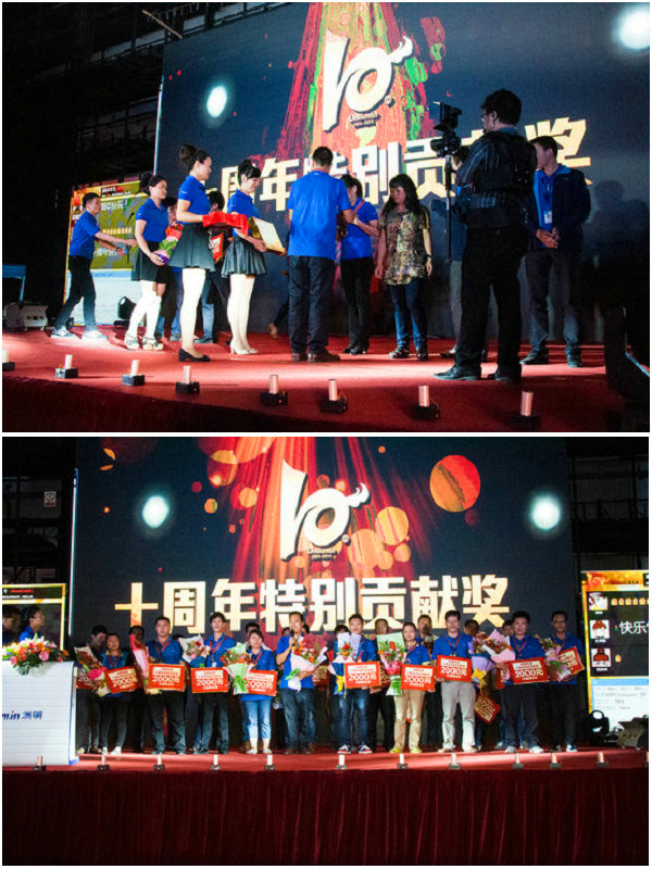 分享完生日蛋糕,又是分享荣誉的时刻,为感谢陪伴公司一路成长的老员工,晚会特别设置了“十周年特别贡献奖”颁奖环节,选定30名8年工龄以上的老员工,林总亲自为每一位并肩奋斗过的元老级员工颁发纪念奖章和物质奖励,真诚感谢他们一直以来对公司的全力贡献和坚定信任。