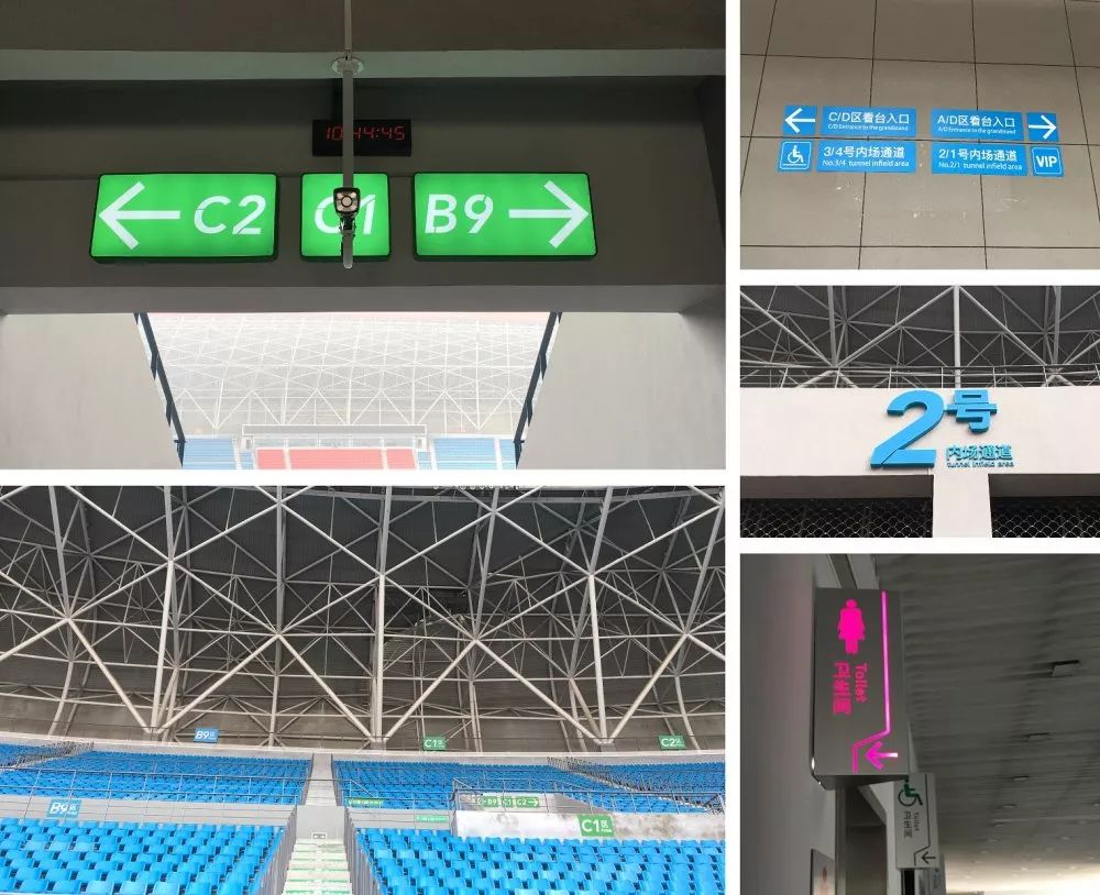盐城体育中心标识导向系统的深化设计遵循人性化的设计理念,充分考虑观众的路线习惯,能够快速的引导方向。标识产品整体造型简约又有内涵,在满足功能的基础上充分考虑盐城体育中心的品牌形象、文化、地理环境特点,并与场馆建筑及装修风格相协调,提升观众的视觉感受,达到美观的效果。