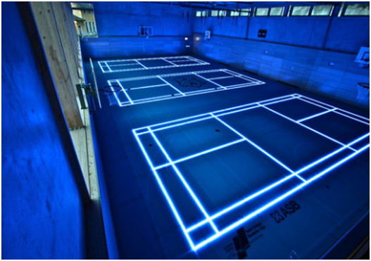 这套采用LED灯的照明系统“ASB glassfloor”而打造的多功能体育场,利用可编程照明室内体育场线以及与特定消息下方的面板功能绘制视频输出的新型玻璃表面。该系统触摸一个开关后可用于照亮不同的场地,适应如羽毛球、篮球、室内足球、曲棍球、手球及排球等多种体育项目。